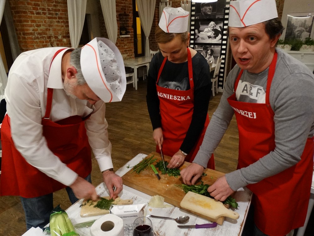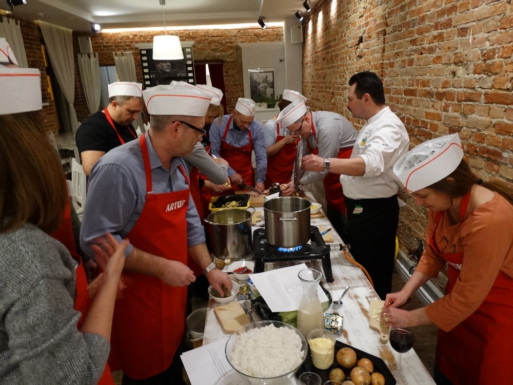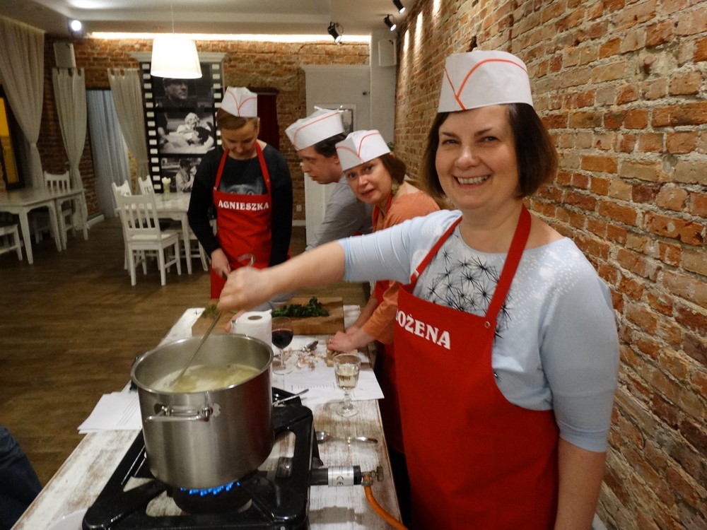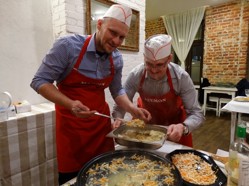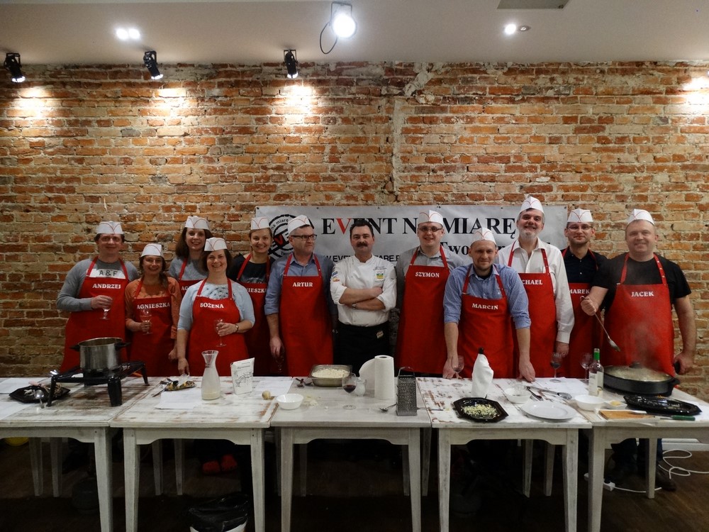 Dzisiejszy wieczór to event kulinarny. Warsztaty kulinarne jakie dziś przygotowaliśmy to kuchnia Polska, był żur, gołąbki i Sandacz po Polsku. Każdy z uczestników warsztatów kulinarnych brał czynny udział w przygotowaniu potraw, nikogo nie ominęło obieranie ziemniaków czy siekanie pietruszki.