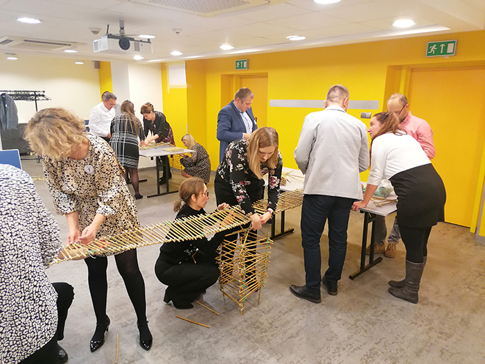 Dwa stoły oddalone od siebie o 3,5 metra przestrzeni, odrobina materiałów i ograniczony czas. Brzmi znajomo? Zespoły muszą wspólnie zaprojektować i zbudować konstrukcję, która nie tylko się nie rozpadnie, ale… przejedzie po niej nasze firmowe auto!