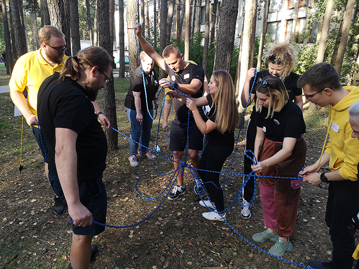 Uczestnicy działają dla wspólnego celu, ucząc się, jak dzielić się zadaniami i wspierać wzajemnie — dokładnie tak, jak w codziennej pracy zespołowej.