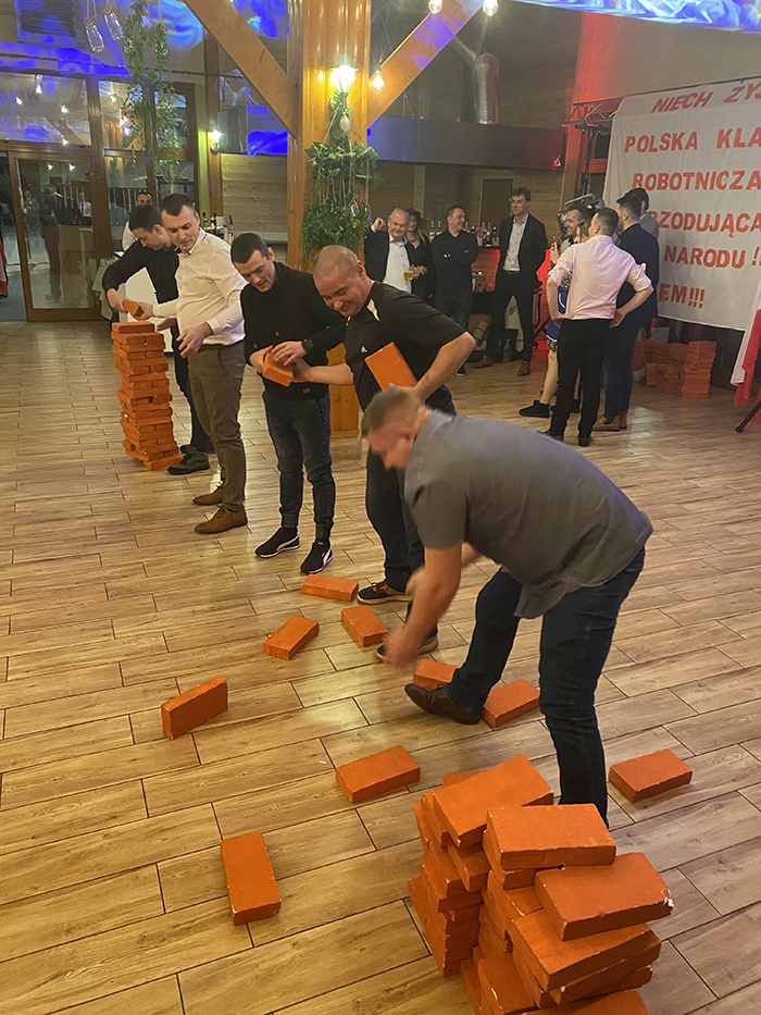 Wieczór PRL najlepiej działa przy grupach od 30 do 120 osób, ale śmiało ogarniemy też większe delegacje. Dzielimy uczestników na „Zakłady Pracy”, co automatycznie buduje grę zespołową, śmiech i luz. Format świetnie sprawdza się na firmowych integracjach, konferencjach i imprezach tematycznych.